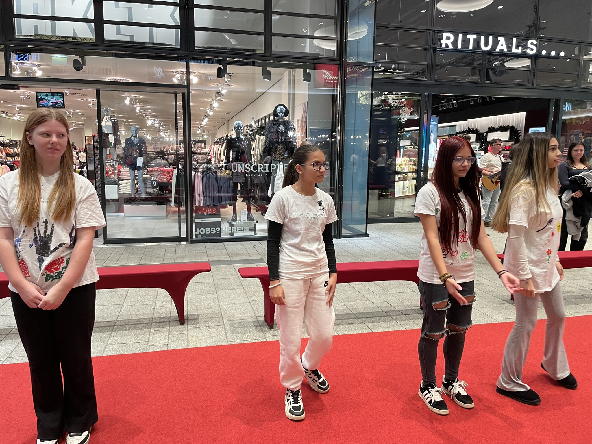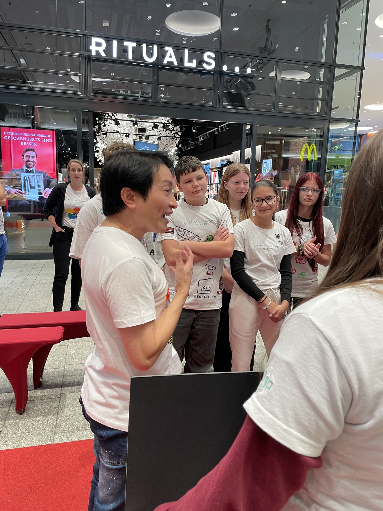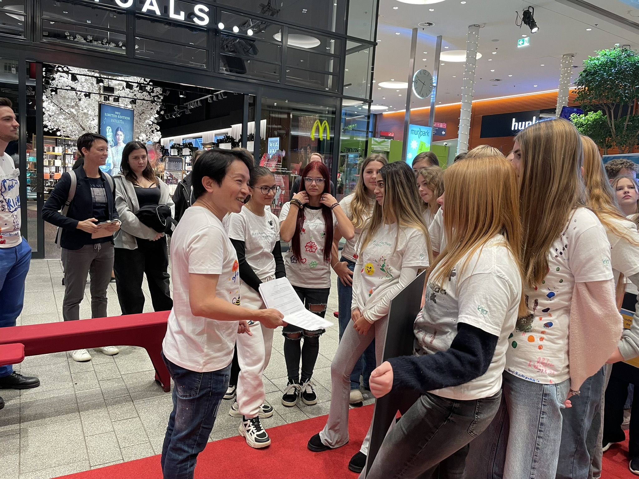 Unsere Kinder präsentierten ihre selbst gestalteten T-Shirts in einer Modenschau– begleitet von Kinderrechte-Songs und viel Applaus.
